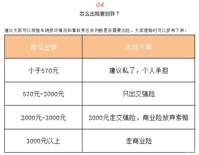所以如果是交强险出险,报销金额在570元以内的,并且没有人伤的情况,尽量选择私了。