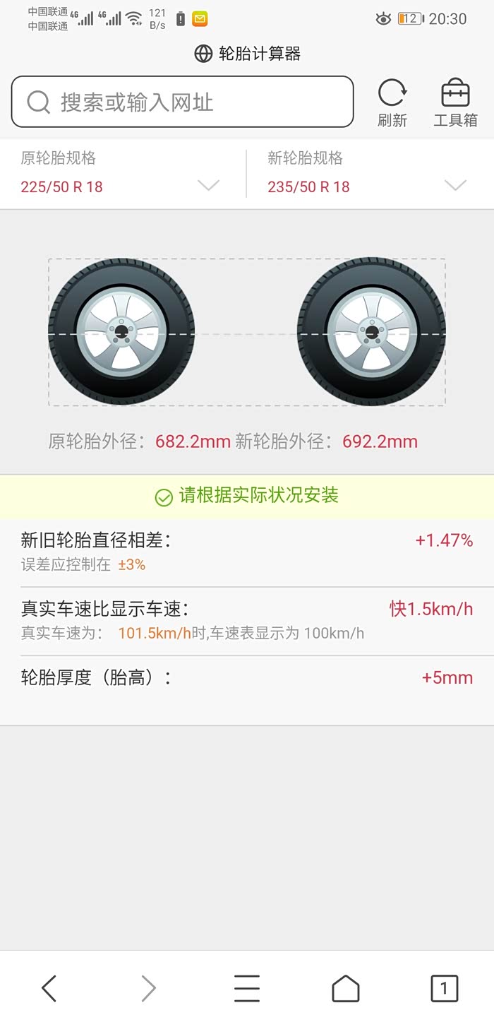 原车用的是225/50/18防爆胎,经常查询,可以更换的普通胎很少,通过计算,可以更换成235/50/18和235/45/18这样轮胎稍微宽一点点,