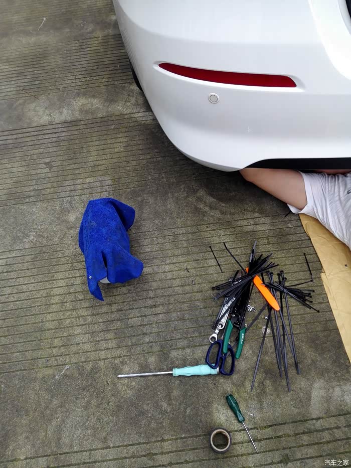 先把连探头的4条线从左后边的过线圈里走下去,过线圈里有一条线,应该是刹车灯吧。接好探头后再拉上来,探头的线用扎带扎在后防撞梁上。