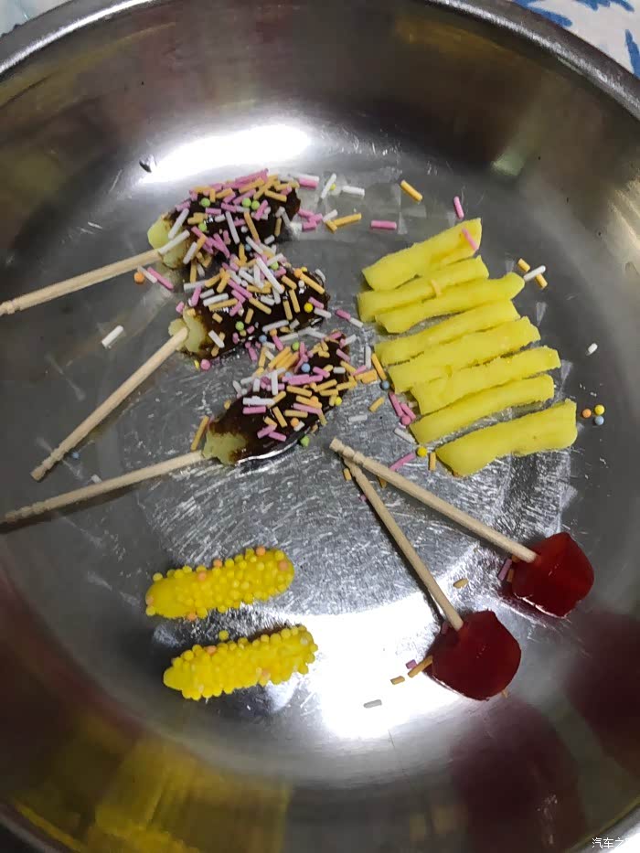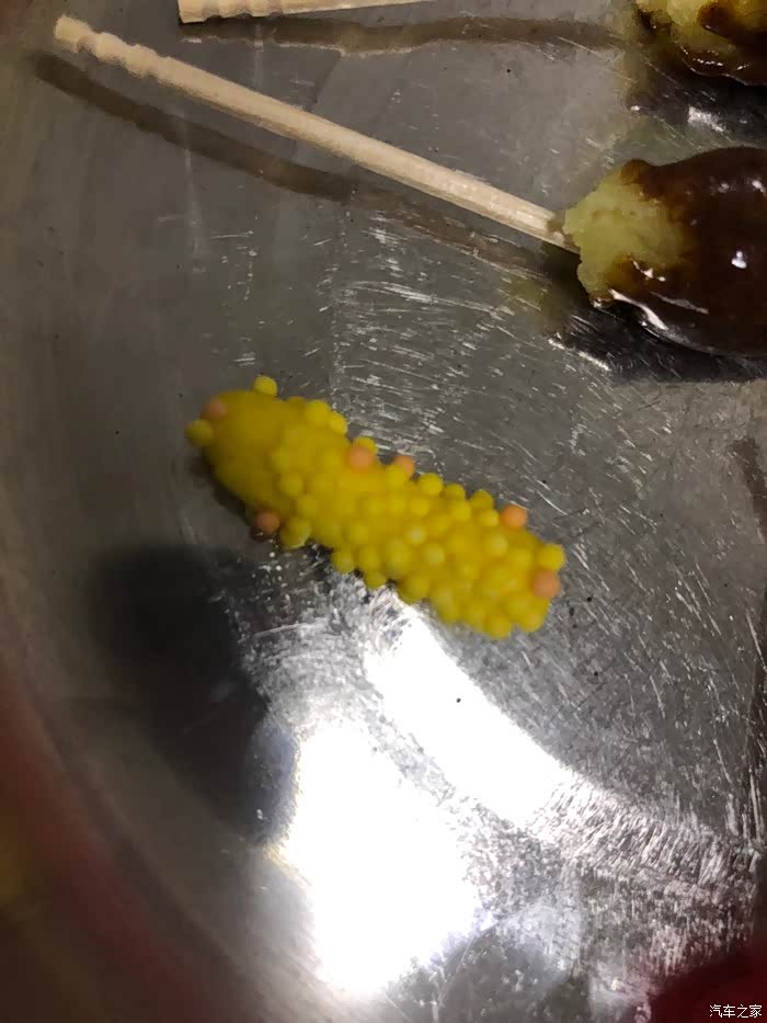 拿出玉米在模具里滚来滚去。沾糖。沾好后如图