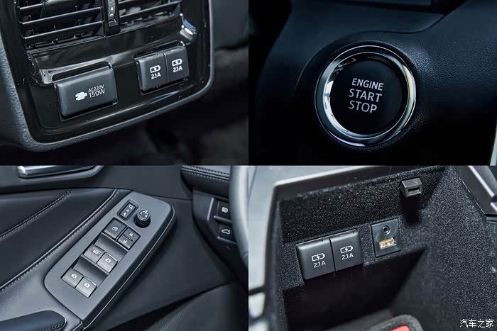 扶手箱内有2个2.1A的USB充电接口和1个USB接口,后排出风口有2个2.1A的USB充电接口和1个220V的插座。在这个离了手机就活不下去的年代,那就得备足了充电接口,另外还配备了一键启动按钮和四门车窗一键升降功能;功能配置够丰富,细节做得不错。