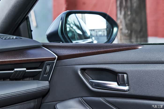 前车门内饰上部与中控台的相连处,采用了棕褐色实木装饰,非常高级,视觉效果很好,质感也很独特,容易打理和保养。