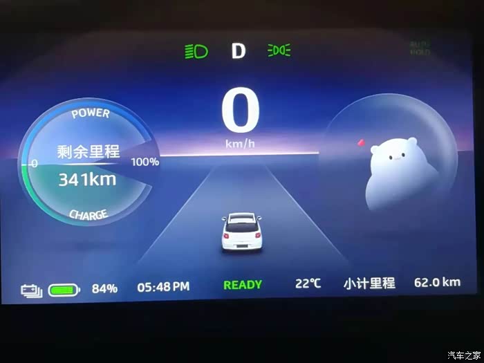 用慢充充了一晚上,100%满电出发,开了62km,还剩341km续航,加起来341+62=403!