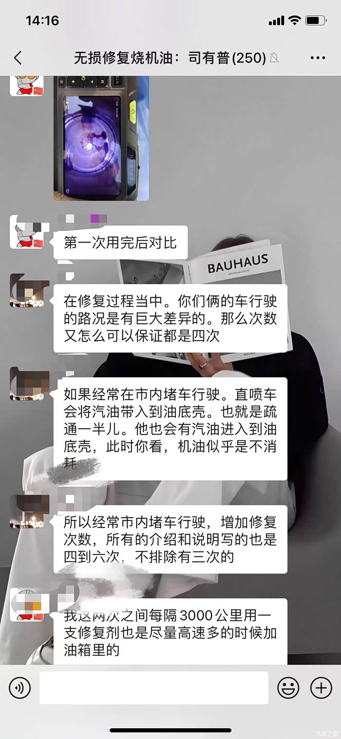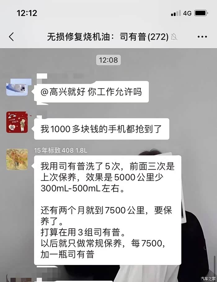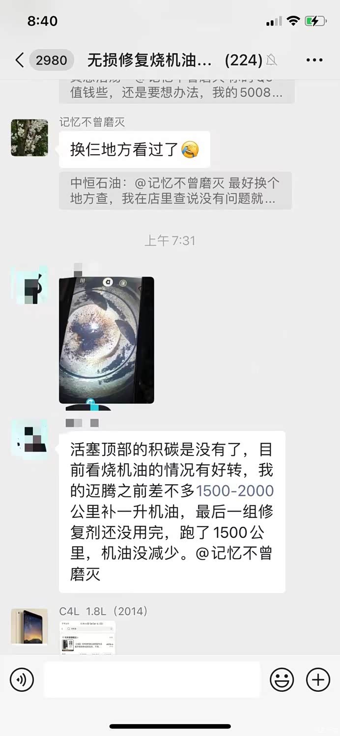 偶然一次在论坛认识了一位408车友看到他发的帖子烧机油修复好了,而且是通过加添加剂的方法修复好了,也不用大修,很神奇,于是就联系了这位车友,加了VX把我拉进了群里,我在群里潜水了几个月一句话没说过,偶尔看看,看到好几个车友都说修复好了,而且清理积碳效果贼好,下面是群车友聊天截图以及检查时候拍的图片