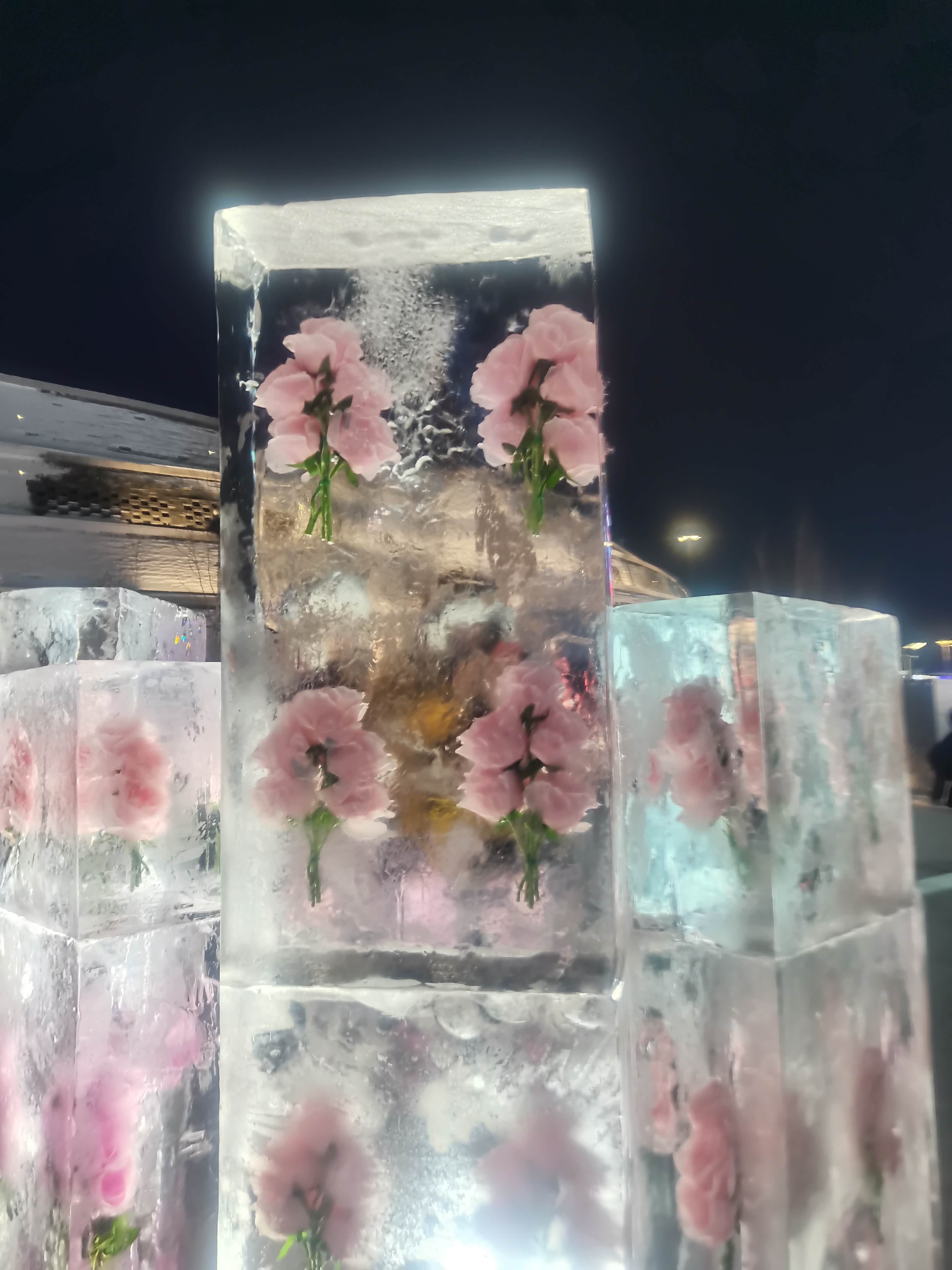 菩萨身旁,几簇“冰中花”悄然绽放。匠人巧妙留存冰内天然冰泡与纹理,雕琢出牡丹的雍容、寒梅的傲骨,花瓣边缘的弧度细腻得仿佛下一秒便会随风轻颤。灯光穿透冰层时,花影在地面流转,似真似幻,让人分不清是冰孕出了花,还是花融进了冰。这里的冰,是冬日最纯粹的信使。它不似玉石般张扬,也不似玻璃般冰冷,只以通透承载万物——既装得下菩萨的禅意,也藏得住花草的生机。指尖轻触冰面,凉意顺着指尖蔓延,却让人更清晰地感受到这份纯粹:没有杂质,没有喧嚣,唯有冰的洁净、雕的匠心,在寒冬里静静诉说着关于美丽与信仰的故事。