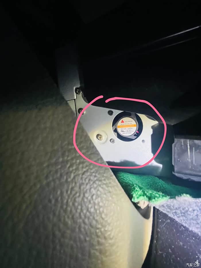 1.机舱内汽车主板散热风扇,进风口在副驾驶脚上部分,此风扇在机舱保险丝盒内,若车内动静很大,需要考虑拆下注油或更换。此风扇会在开车门后自动启动,锁车30分左右后自动停。(我车声音生产未拆修)