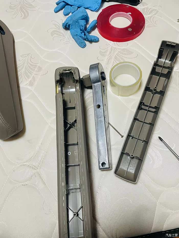 进阶版,动手能力强的可以搞。扶手转动支架内轴估计出厂间隙就大,需要暴力拆开这个梅花扣,没有专用工具拆,用平口螺丝刀和锤子