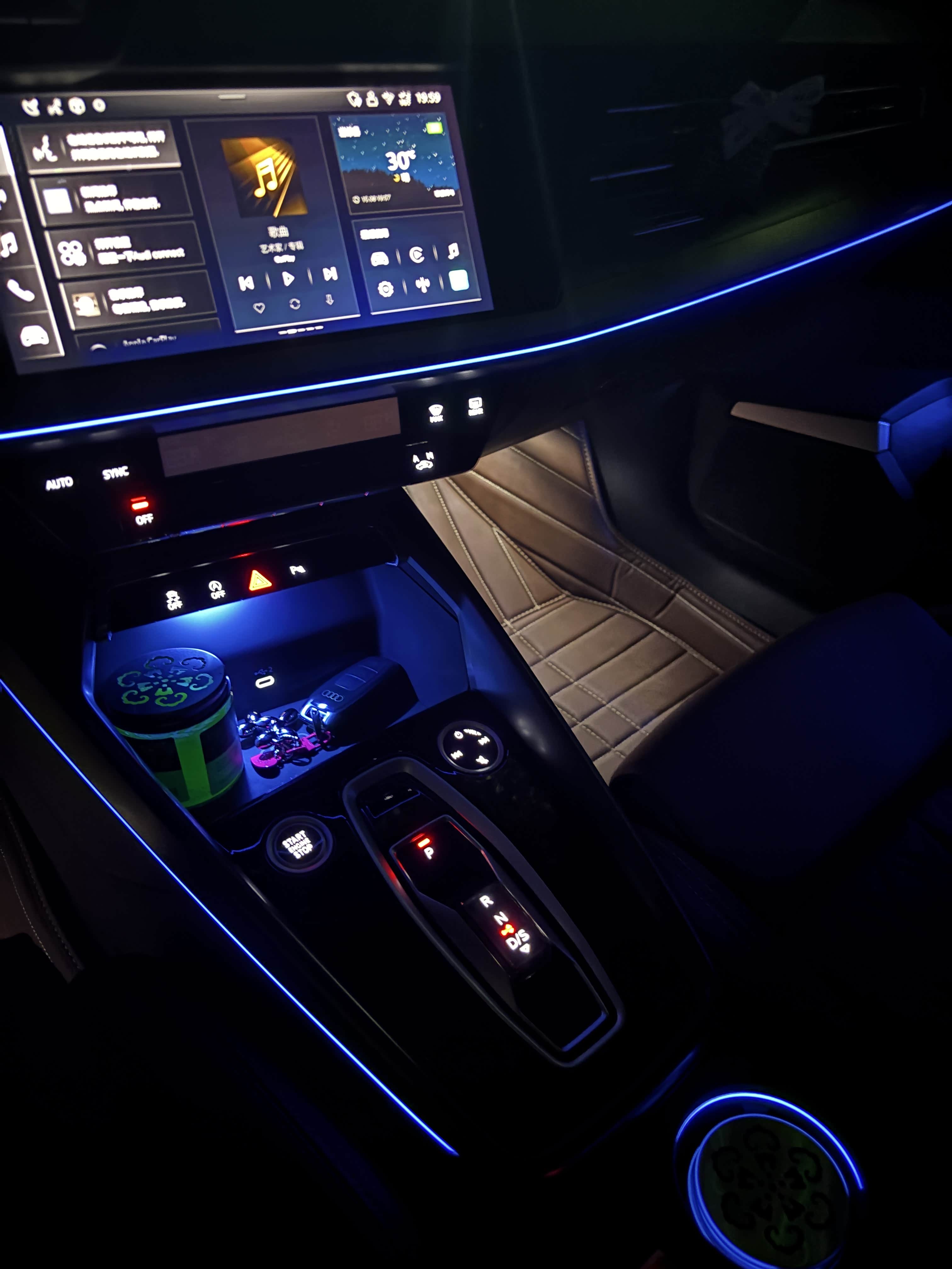 晚上一个人坐车里,对车机进行了熟悉,可调的氛围灯沿仪表台流淌,让机械有了温度。搭配了个简单的钥匙挂件,壳+马蹄扣+挂件,跟他的颜很搭。穿了车衣,车身更有光泽,又不怕轻微剐蹭。因为使用苹果手机,按下启动键,自动连接CarPlay,设置了迎宾语,导航自动在屏幕上,具有仪式感的驾驶之行即将开启。另外导航和听歌的页面能同时在屏幕上,非常省心。车载中控以及车内按键也很好上手,逻辑清晰,一目了然。虽然通勤往返50公里,但基本为高架,不在市区穿行,还是蛮省油的。在没阳光的地方,总爱欣赏大灯秀,奥迪不愧为灯厂!总而言之,爱不释手。