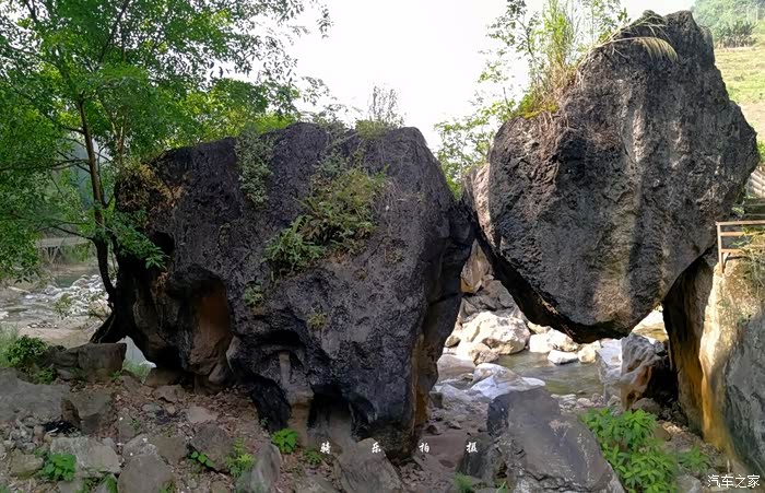 谷里的巨石千姿百态,让人惊奇,有的石块朳在大石的斜背上,居然不会滑滚,有的石块挟扎在两块大石之间,也不会掉落。