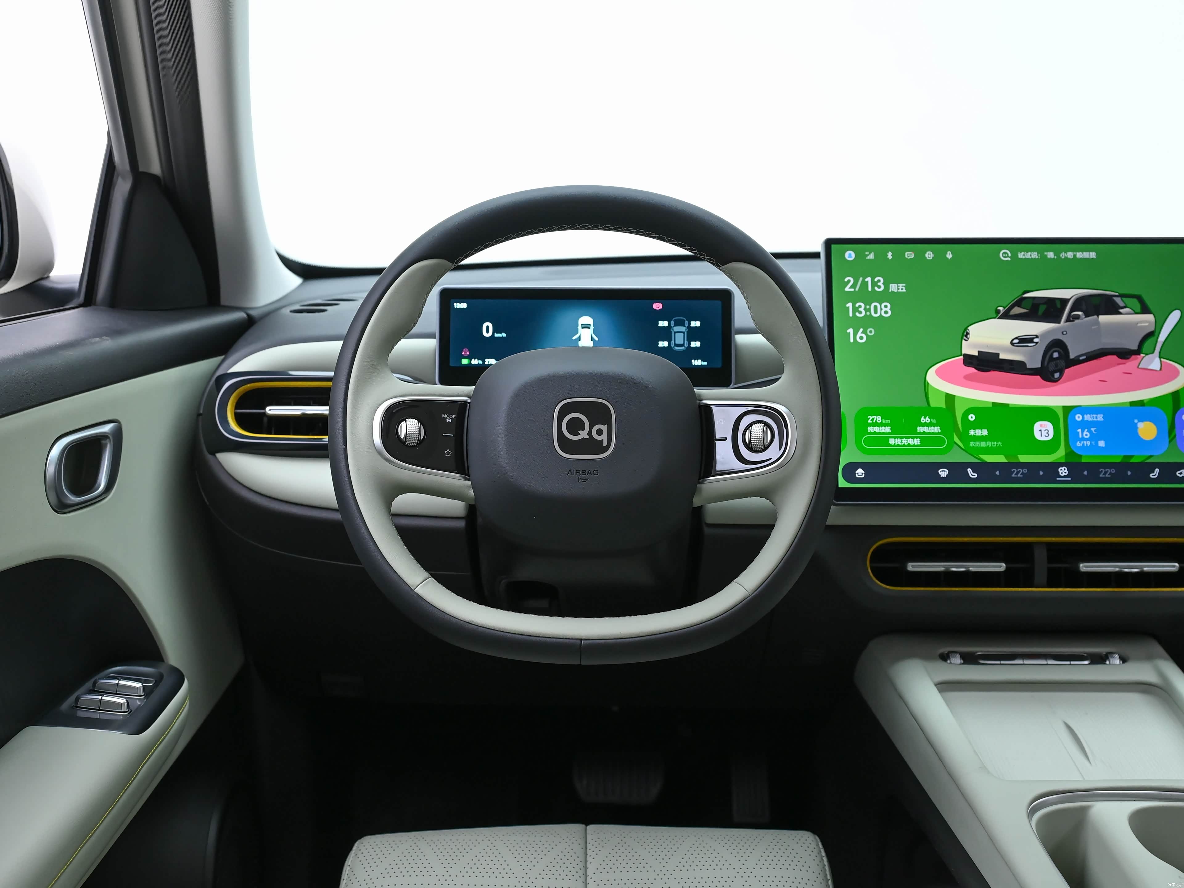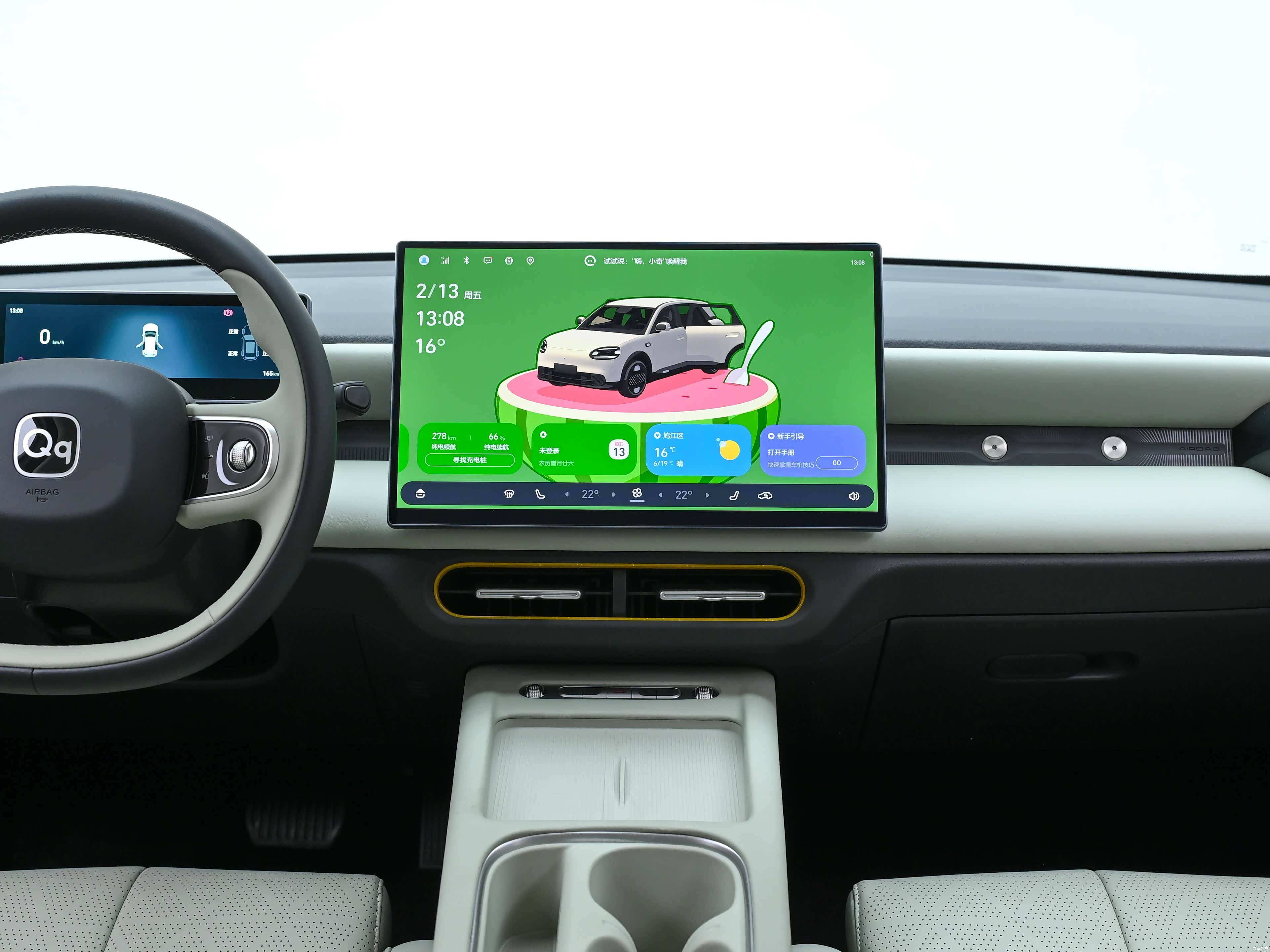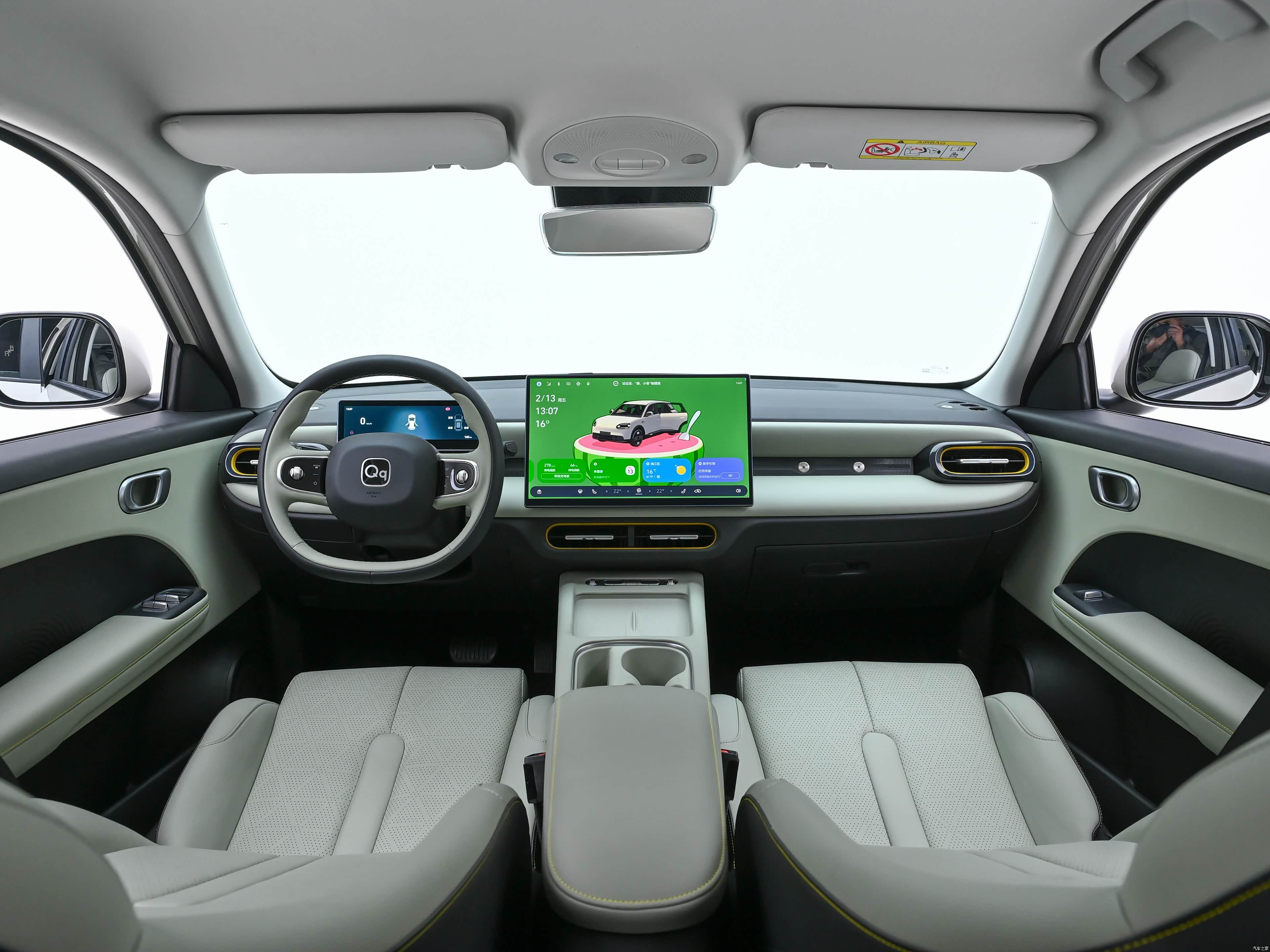 坐进车内,QQ3 EV的内饰直接颠覆了我对入门纯电小车的认知,没有廉价的塑料感,整体设计简洁大气,质感拉满,而且智能化配置直接拉到顶,核心就是这套AI灵犀智舱,这也是它敢叫板同级的核心底气。