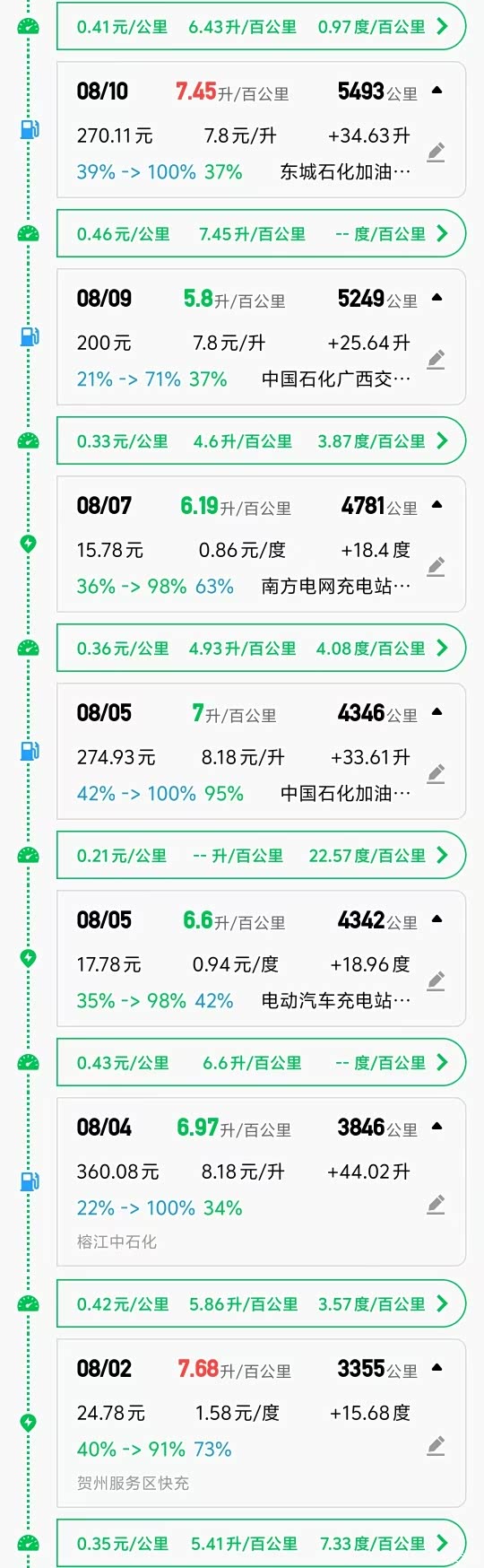 路线为顺德出发,途径桂林-肇兴侗寨-榕江村超-天眼FAST-旧州古城-织***远古镇-阿西里西韭菜坪-阿西里西大草原-奢香古镇-黔灵山公园-柳州龙潭公园-顺德。出发表显3070KM,返回到地库表显6014KM,全程2950KM,驾驶+乘坐共6人,行李满载,90%路段高速。共充电3次,加油4次(出发满油满电,到家油箱还剩40%),油电花费共约1400元+,没算加油优惠前提下每公里不到5毛,个人觉得非常NICE。