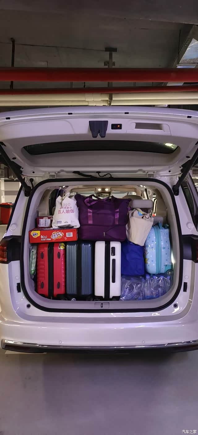 收纳:后排座椅推到最后,三个20寸登机箱+一个小朋友收拉箱+两箱水+杂七杂八的大小包包全部拿捏。
