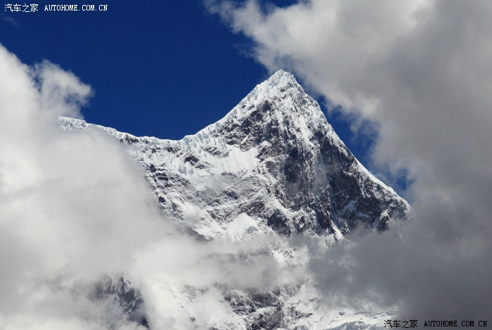 海拔8516米的洛子峰(照片正中珠峰左后云里那个小尖尖)与海拔8844.43米的珠穆朗玛峰紧密相连、亲密无间