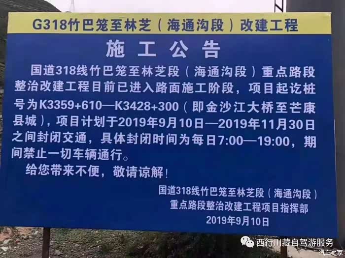 进藏前一个月我们就一直在关注318的路况,最近的路也就是我们现在走的这条线,巴塘-海通沟-芒康,距离100公里左右,路过海通沟,有50公里烂路,保守估计,半天也能到达。但是由于突发情况,从9月10日起海通沟修路,交通管制了,为期接近三个月,白天车辆无法通行,晚上怕堵车,黑灯瞎火的很危险,出了事救援都不好救援,完全打乱了我们的计划,我们不得不考虑绕行,绕行方案1:稻城—杜鹃花谷—东旺乡—飞来寺—盐井—芒康(回到318)—左贡,绕行方案2:巴塘—白玉—江达—昌都—邦达(回到318),走这边据说有几十公里的超级烂路,小6肯定是无法胜任的,绕行方案3:理塘—桑堆—乡城—得荣—奔子栏(回到318),只有走飞来寺那边,要绕行800公里,这太可怕了,