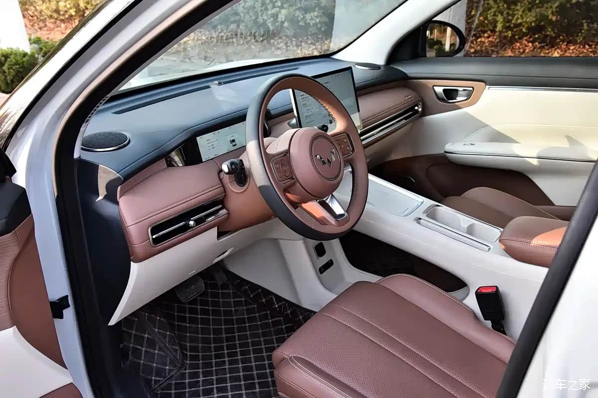 车辆内部采用拼色设计风格,方向盘采用三幅式多功能设计,中控下方为镂空,设有12伏接口和两种纯电接口,上方设计有两个杯架等。