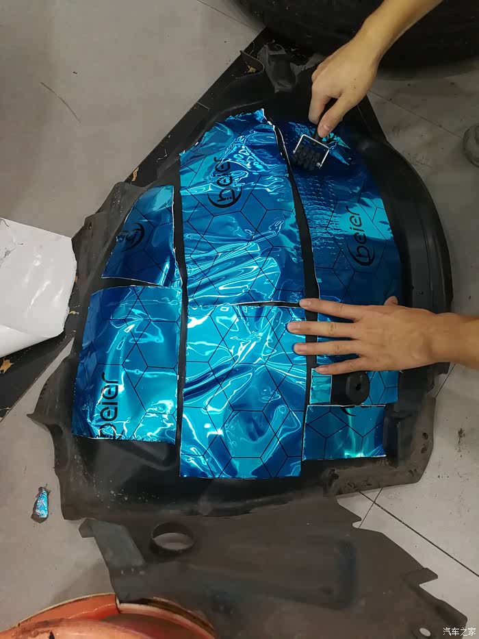 前轮,叶子板内再贴一层温莎,就是吸音棉,吸收和降低噪音