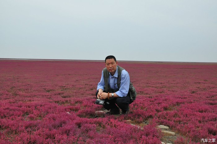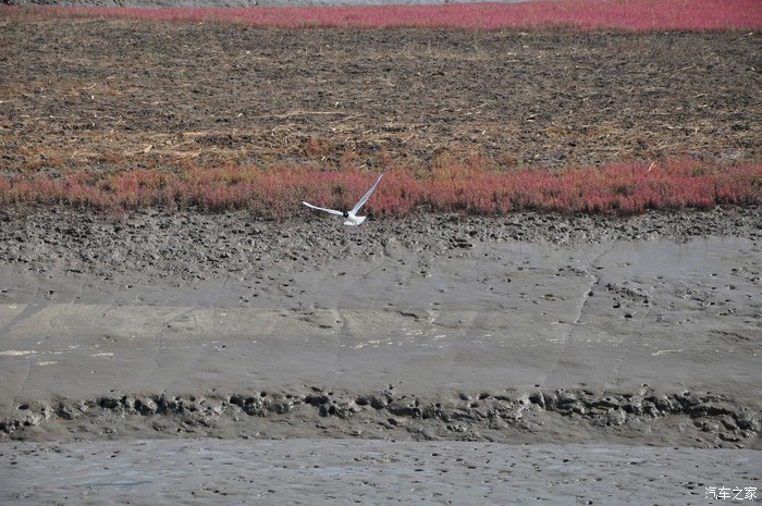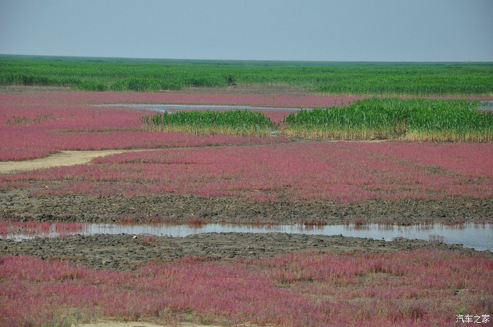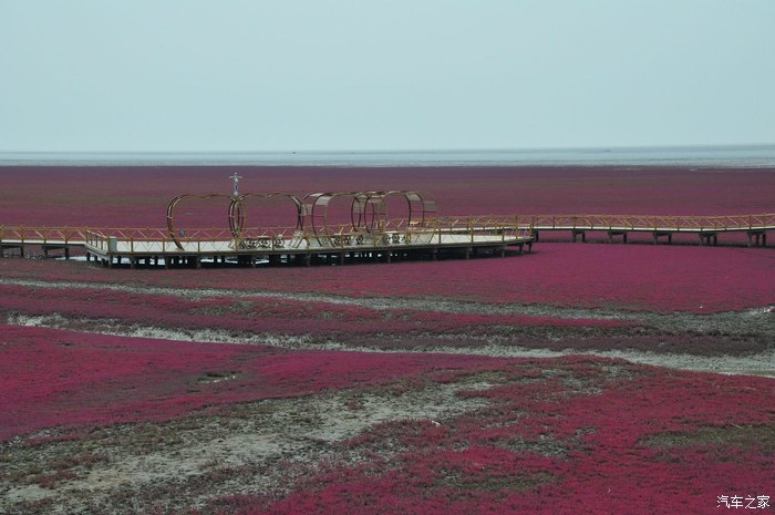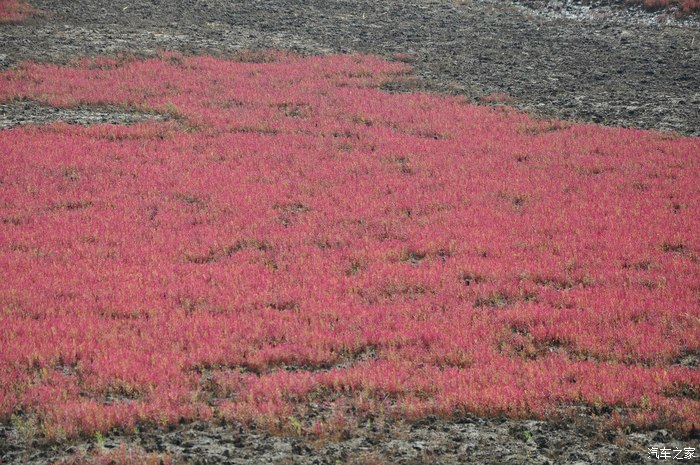 第二天一早,吃过早饭,驱车直奔红海滩,到了以后发现,红海滩景区关闭了,心中很郁闷,再一打听,原来关闭的是苇海观鹤景区,为了保护丹顶鹤,看红海滩要去风景廊道那边,距这里10公里,于是,顺着路标,赶往红海滩国家风景区廊道,到那里,买票,每人85元,每辆车20元,景区很大,有10几公里,可以开车进去一个景点一个景点的看。所谓红海滩是在海滩上生长着一种叫碱蓬草的植物,每年4月从海滩上长起,6月开始变红,到9月变得火红火红的,几十公里的滩涂,火红一片,蔚为壮观。是难得一见的奇景。