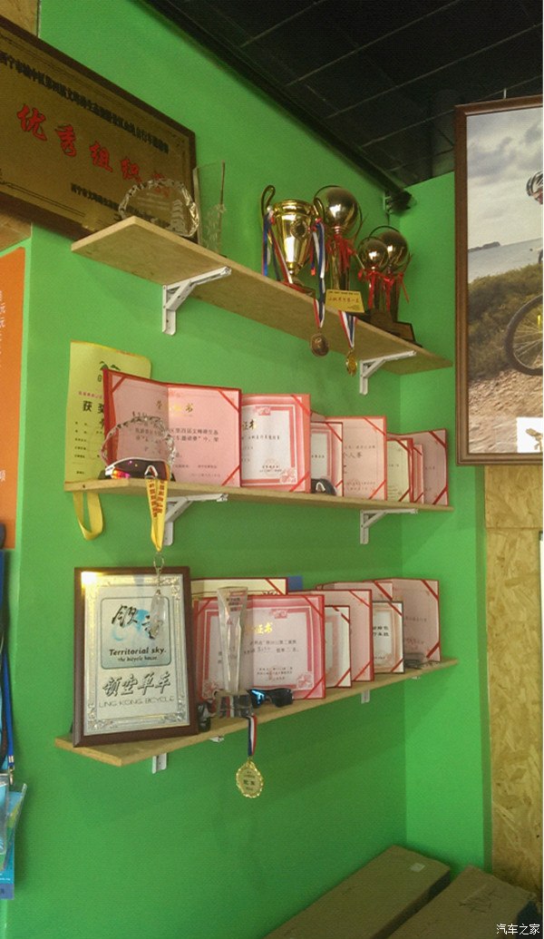 这是我提车那家店刚进门的展示架,一位老板参加业余比赛的奖杯和奖状,相当牛。(借用网络图片)