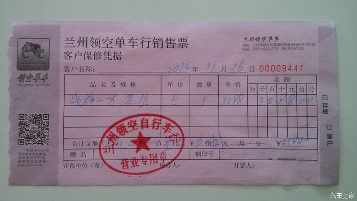2014年11月16日(这日子似乎有点顺啊),我车祸受伤后第100天(有点纪念意义啊),提车了。我提车的这家店,位于我家和单位之间,以后维修保养不是问题。老板(店是2个人合开的)服务态度很好,其中一个老板很厉害(成绩很好的业余车手,给人的感觉有点冷、有点酷),早上10点半,我和老爸、老婆、姑娘一行4人浩浩荡荡到店,第一次去的那个老板一个人在店里,知道我来是提车的,之前也已经商量过价格(这家店至少来过5次了),所以没有什么讨价还价,寒暄之后直接开始调试车子。这时店里来了一位车友,17岁,高中生,骑了一辆我认为外观很炫的公路车,来店里取快递,询问得知,车子四万多(咱不懂,但至少眼光不错),真是开眼界了,没亲眼见过比这更豪的车了。老板调试车子时,我也向他请教了车子使用中的一些问题,例如车子充气、清洗、上油等细节问题,老板很热心的帮我把码表安装好了。最搞笑的是,老板调试好车子让我到门外步行街上试试车时,我弱弱的问了一句:“能不能给我教教怎么变速?是把变速把手压下去一会再放开还是一压就放开?”老板有点无奈,但还是很耐心的教我了,随即我在店门口迫不及待的骑了一会,感觉真是爽啊,怎么这么轻呢?这车子确实比我高中骑行的那辆车子棒多了!赶紧刷卡付款,提车骑行回家。车子是3598,送了水壶架、水壶、护链贴、绑腿、头巾、挡泥板、充气转换嘴(不确定是否就是这个名字,下面图片说明)。唯一遗憾的是,太过兴奋,忘记拍照了。