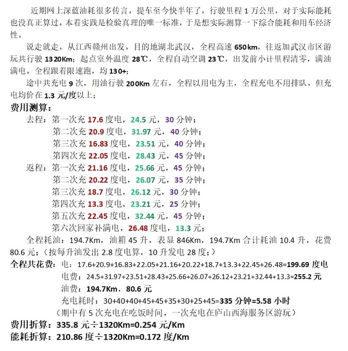 近期网上深蓝油耗很多传言,提车至今快半年了,行驶里程1万公里,对于实际能耗也没真正算过。本着实践是检验真理的唯一标准,于是想实际测算一下综合能耗和用车经济性。
