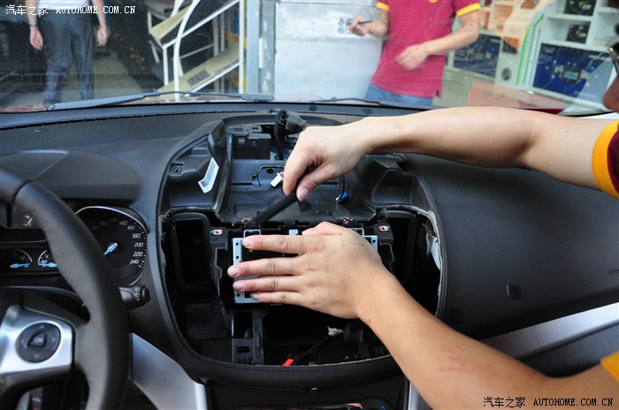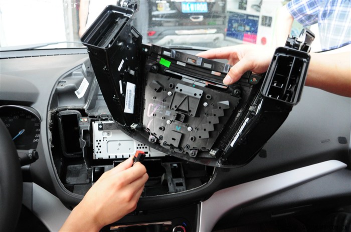 1.用7MM六角镙丝套筒拆掉两颗原车机板固定镙丝,用刮板小心的顶起板块,如果怕弄伤可以贴美纹纸再弄!