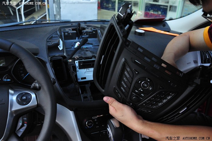 拧开中控空调出风口按键面板的固定镙丝,拔掉背后的各插头,,如下图: