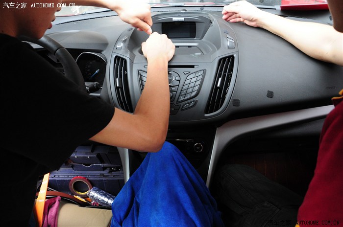 第十七步:刚好可以贴个导航屏幕膜,先保证没有灰尘,然后就简单了,这种三层膜,有两层保护膜的,超好贴的,师傅说这样贴好好贴,一个泡都没有!!