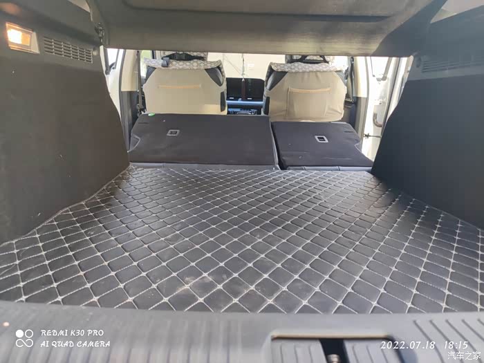 后排座椅放倒后样子,由于有坐垫阻挡,后排座椅未放到最低位置。,这个角度大家也能看到几乎纯平。