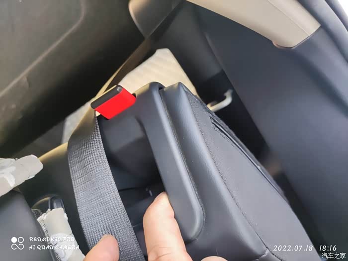 后排座椅复位,只要看好安全带位置,直接后推即可,复位后红色卡扣缩回。