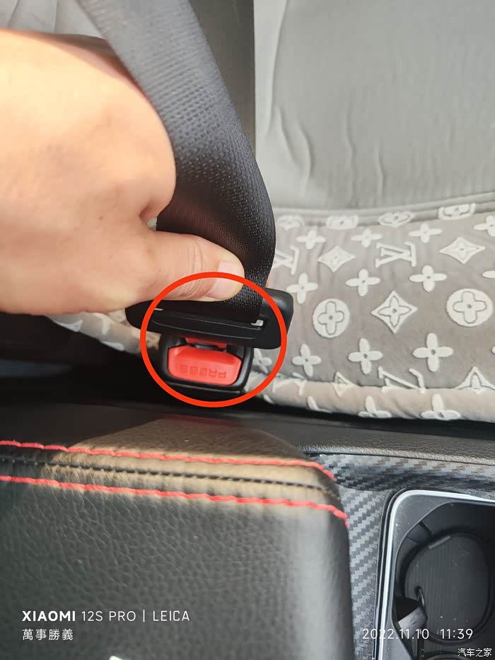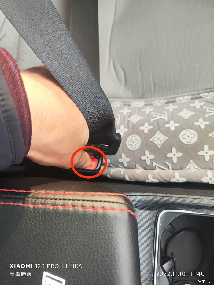 用手按下红色圈内按钮可以高低调节安全带位置。