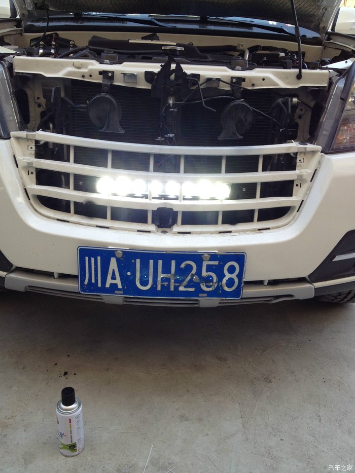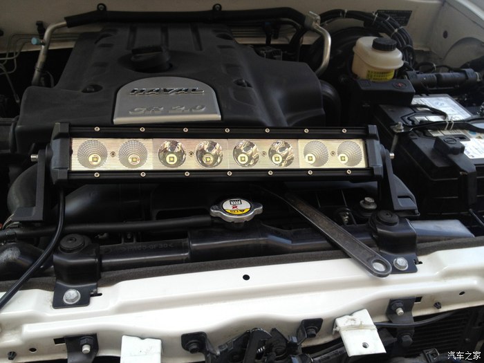 这次的主角出场,其实第一张图里面就已经出场了!这里再隆重介绍一下吧。进口CREE长条LED射灯。单个灯珠10瓦,总共8个,所以是80W,射灯选择的是中间4个聚光,左右两边各两个散光的。左右两边两个散光的好处是开启的时候可以照亮车头前方左右两边的道路,原车的灯光基本照不到。