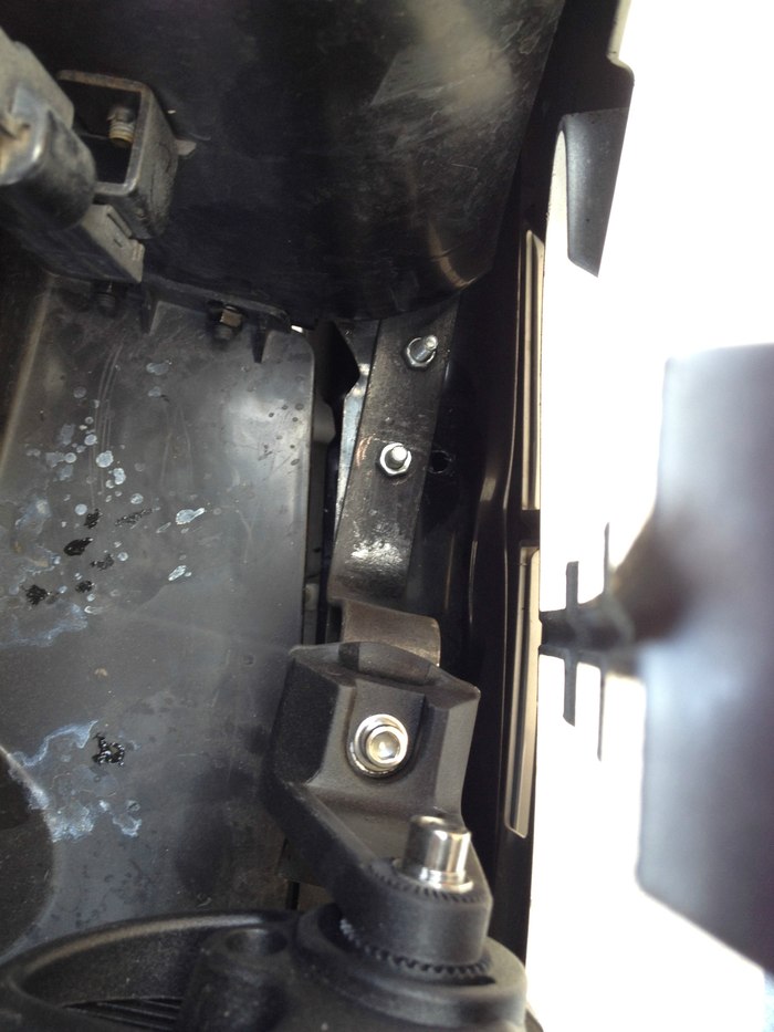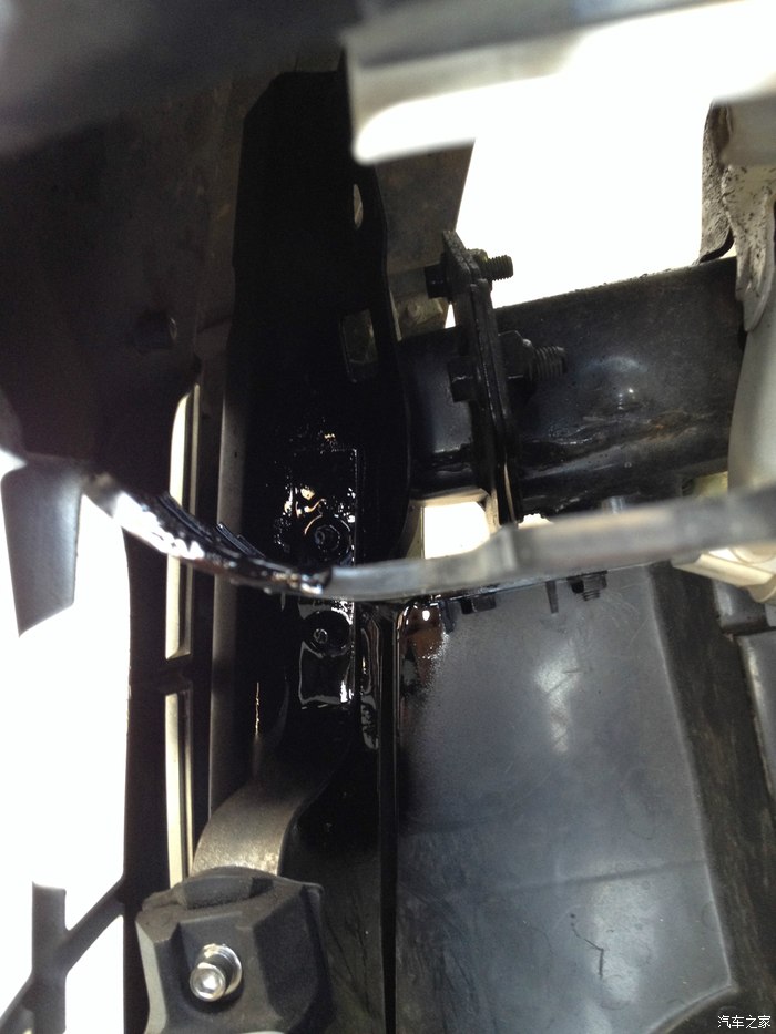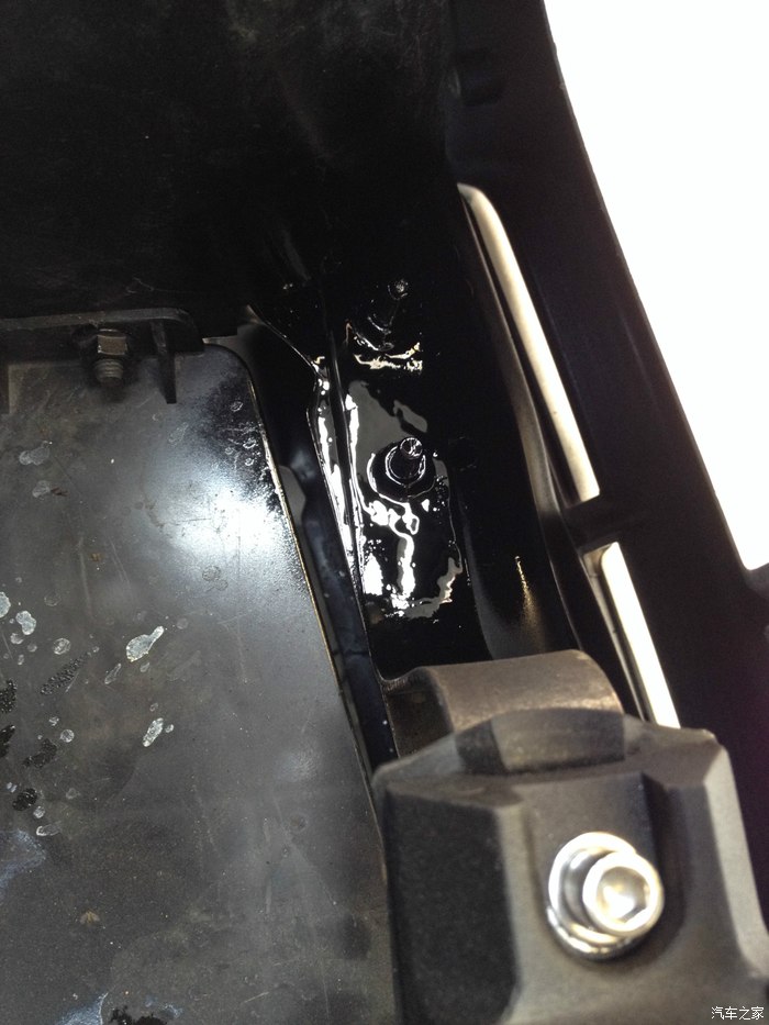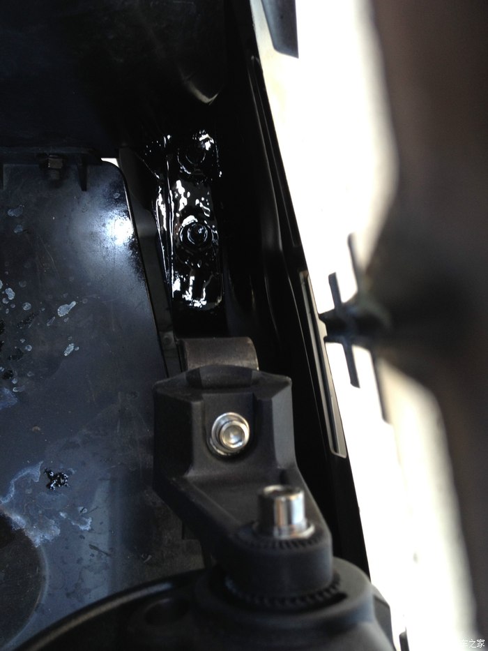 另外一变的样子,同样两颗螺丝固定。看到下图中防装钢梁上面是不是还有一个空余的洞啊?其实这个就是最开始打的洞,打好之后发现里面其实没办法穿螺丝进去,因为里防装钢梁是两层焊接在一起的,这个洞下面的空的。等于是在防装钢梁内部。所以没办法穿螺丝,只有从新在边缘一点的位置开孔固定支架了。