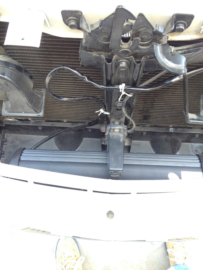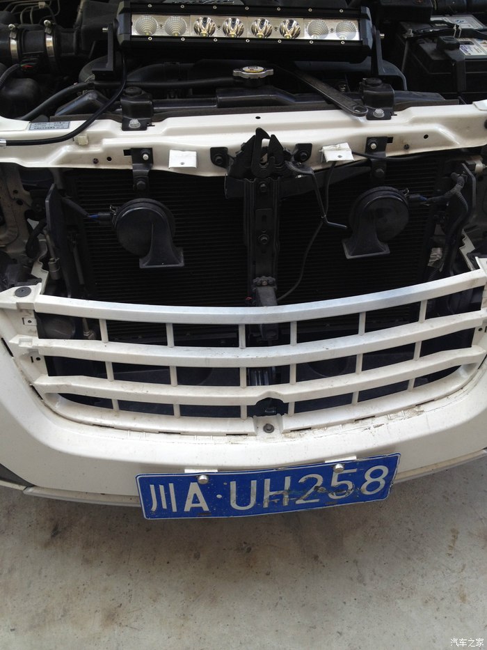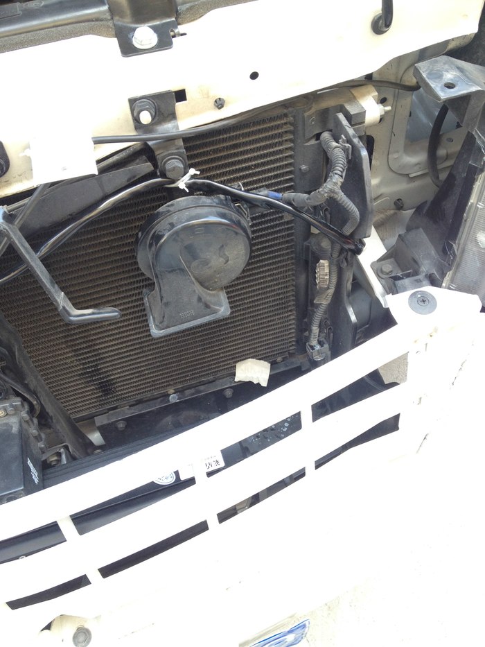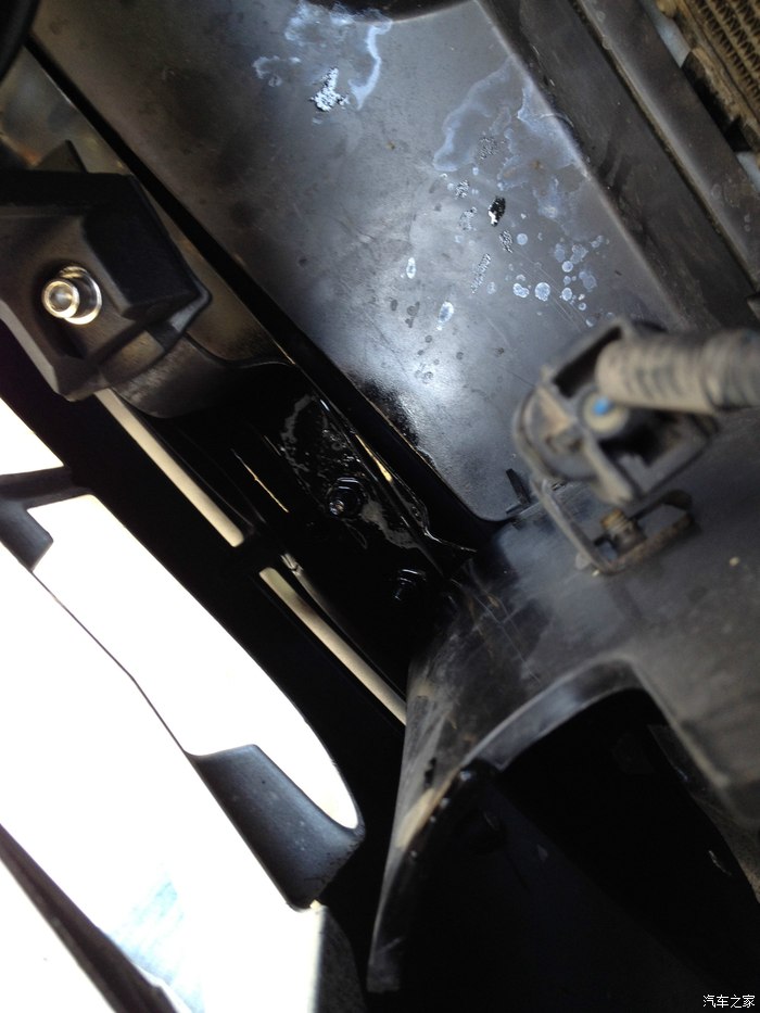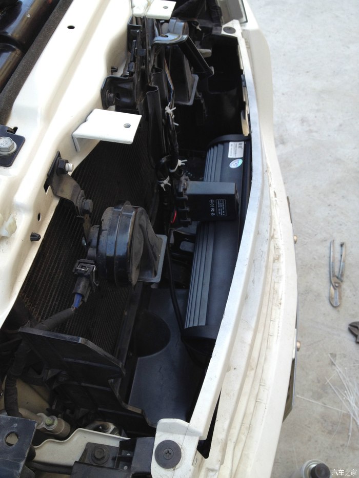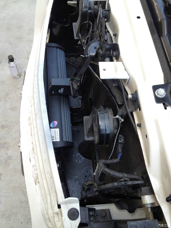 然后走喇叭固定支架上面过去,再走右边下面的洞里面穿进发动机舱里面,