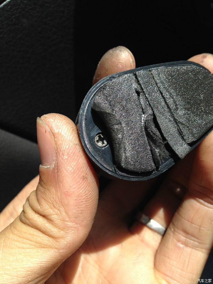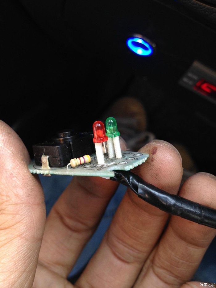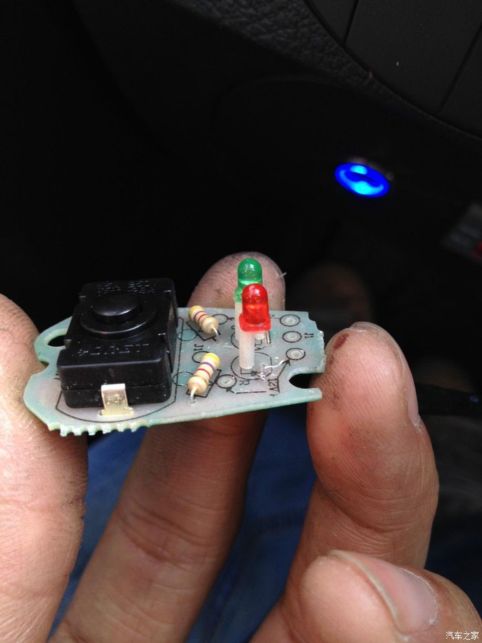 开关的内部就是这个样子的,然后用小剪刀或者指甲剪把红色灯的一只触角给剪掉。这样不开灯的时候开光就不会一直亮着耗费电瓶的电了。请大家无视我那漆黑的手指吧...