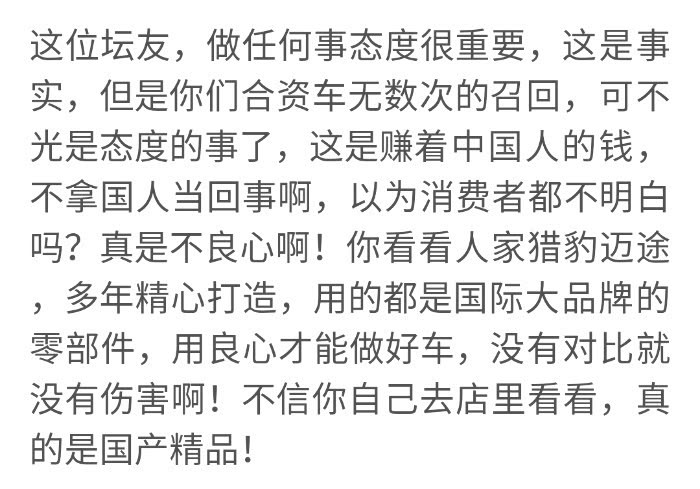 这位车友,我觉得你的理解有一些偏差,国产车不是不召回,而是比较少。从2016年国家质检总局发布的188条汽车召回公告中,召回汽车总量达到1103万辆余,但其中自主品牌召回的数量居然仅为92364辆,只占全年总量的1%,远远低于国外品牌汽车。然而更有意思的是,中国自主品牌每100辆就被发现112个质量问题,比国际品牌每100辆多出了14个问题。这就能说明一个态度问题,不是你说的合资车不拿国人当回事,而是国产车不拿国人当回事吧。不过你说的猎豹迈途,确实是国产车的良心之作,这款车的发动机是宝马授权、中国绵阳新动力生产的1.6T涡轮增压直喷发动机,功率可以做到150千瓦、扭矩为280牛·米,高效省油,匹配7速变速器,润滑和散热效果都很出色,可靠性很高,换挡平顺,听介绍说经过了3万多个小时的可靠验证,覆盖了整个寿命周期的使用状况,600万公里的中国全境极端环境和道路环境的实验,可靠性是非常高的,这样的车还怎么会需要召回呢!