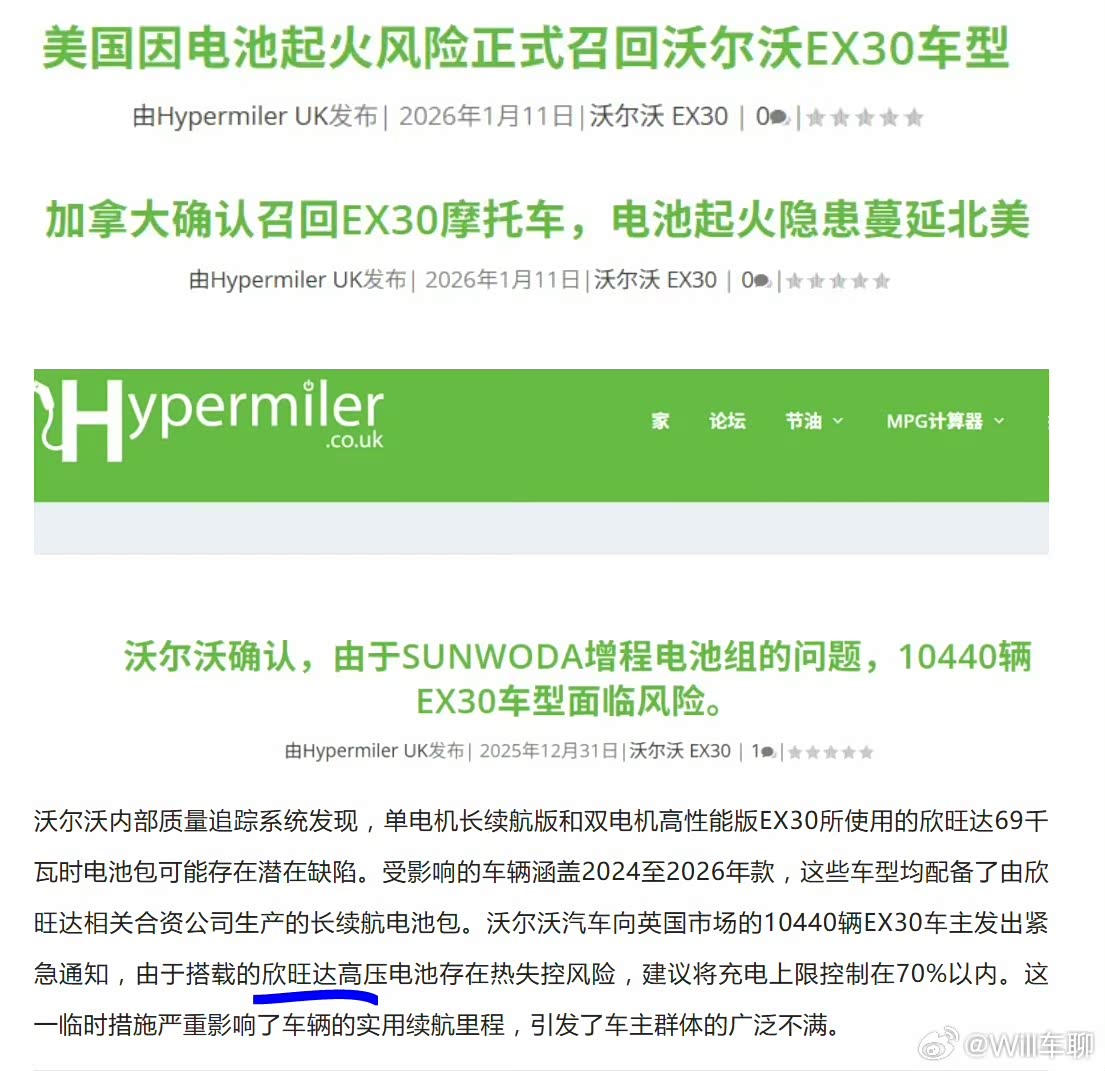 前段时间吉利威睿和欣旺达的电池纠纷刚被曝出,现在沃尔沃EX30又被曝电池召回。