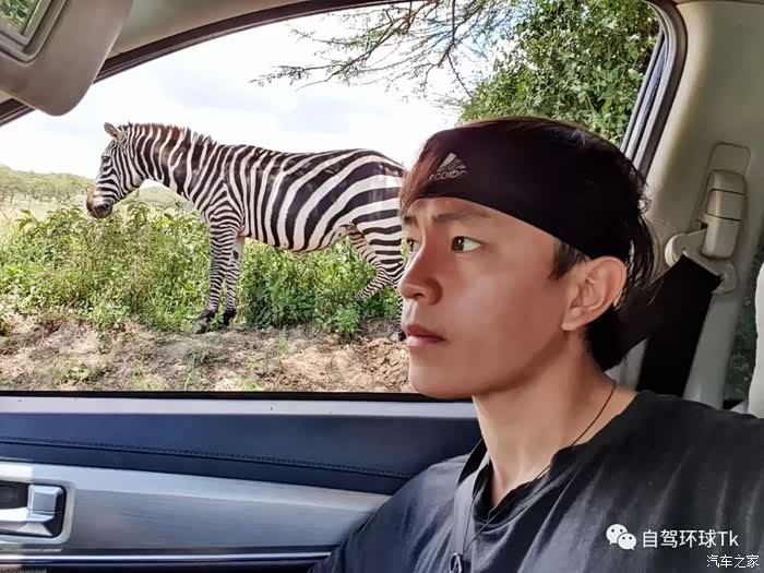 有只斑马走着走着在我的车旁停了下来,我抓住时机拿起手机与它来了个合影,哈哈,表情一致。