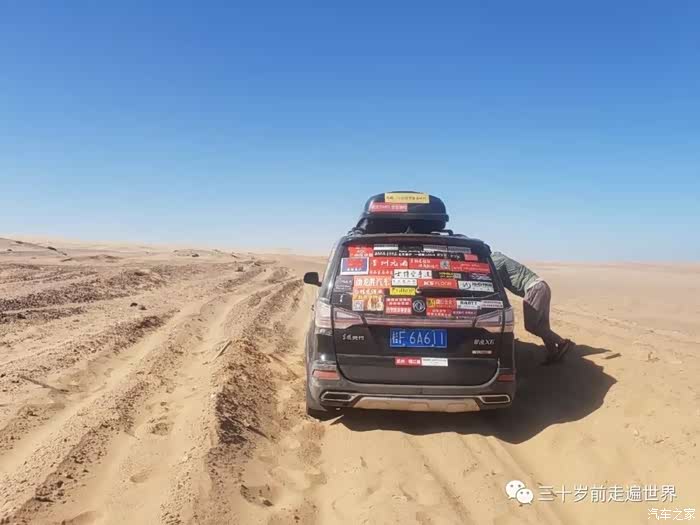 没想到,我们竟然在这样的地方遭遇了陷车。无人沙漠陷车,水源以及食物都不充足,怎么办?首先得自救,我尝试着把轮胎旁的沙子挖开,路上铺上石头和木板,尝试开出,但发现车子就像被粘在地上一般,任凭轮胎如何原地打转,依然纹丝不动。