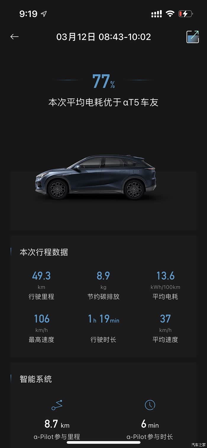 而极狐T5本身出色的电耗表现,更是让我省心不少。今天这段路程,行驶了49.3公里,平均电耗仅为13.6kWh/100km,而且还优于αT5车友的77% 。在这样的电耗水平下,即使电量不多,也能让我安心应对行程。其高效的能源管理系统,将每一度电都发挥出最大价值,在保证动力的同时,实现了低能耗的目标。