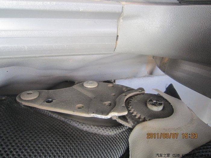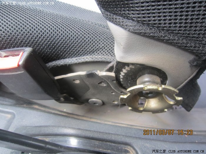 这个问题是老问题了!!有的TX说座椅对换。。貌似此办法行不通啊!我暂时还没加装扶手箱。。但是之前去汽配城安装试过。座椅调节那是相当的不方便啊。。只能下进两根指头。。所以就没装。。前几天看了这位TX的作业。。靠背对换。。不错!http://club.autohome.com.cn/bbs/thread-c-207-9669389-1.html#pid177106463 没有图片。。只有文字。。所以我今天没事。。下雨也停了。还慢热的!我就试试看!!仔细记下了步骤。。上车!!第一步!!取卡子!!我的神啊!在哪呢!!上下左右找了一圈没找到!!先把所料盖拿掉!!我晕!貌似座椅不一样!