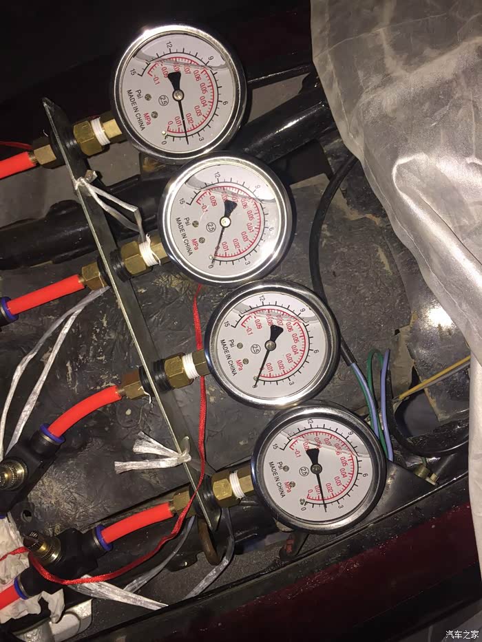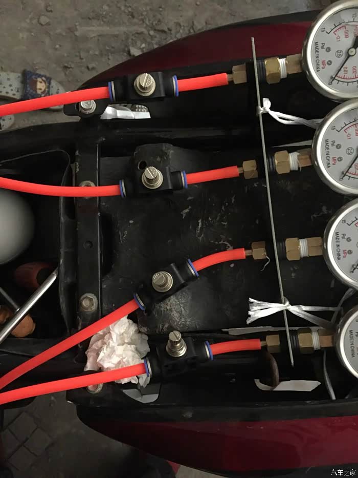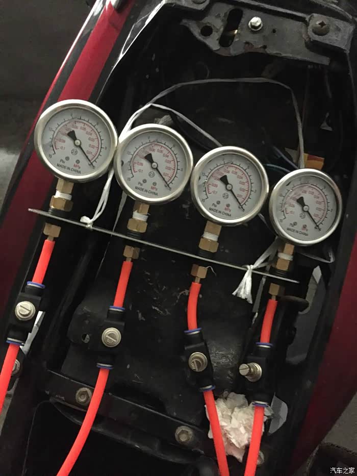 1缸和4缸是一致了,但车要4个缸要一致,因为我把节气门开度调得太大了,导致2和3缸怎么加油都没反应,这时你要把1和4调节气门开度调小,我忘记是顺时还是逆时了,反正自己摸索,铜片开度口调小了会死火,不用担心一边调一边把总怠速微调。不死火就行了,这时你会发现2和3会震动了,94CB是以2缸为基准。压力值调到0.001到0.02这个幅度就好了,不要超过0.02不然调了也白调,回油也慢