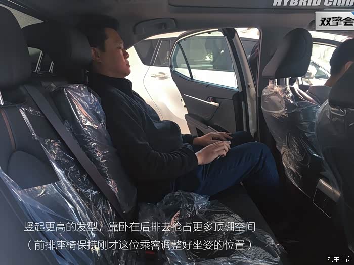 前排座椅保持刚才调节的位置,然后坐到后排仰卧,让头部空间最接近顶棚