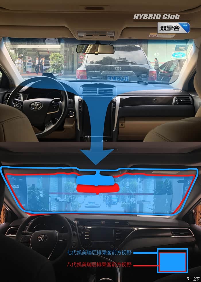 所以另一位车友提及前方视野的问题我觉得比较实在。我用手机分别拍下几乎同样角度第七代和第八代后排前视的范围对比图。对比发现,第八代凯美瑞的车体设计,前排的司机位置视野非常好,这方面在实际驾驶中就已经感受到了,原因是针对司机观察前方路面的角度有所考虑,令驾驶者看到路面面积感觉比第七代更多。但对于后排乘客获得的前方视野,和第七代相比其实是缩小了,估计这和流线型车体的设计有关。如图所示: