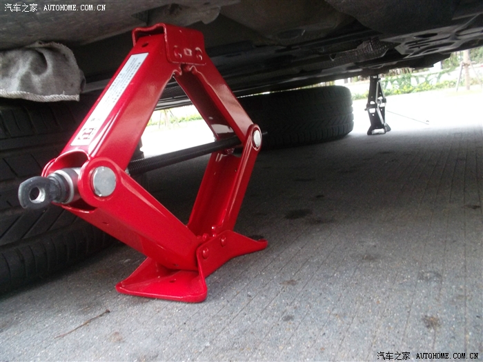 图一:用了两个千斤顶(供参考:红色的是周末在汽配城购买,105元,承重1.5吨。杠杆没拍进去)