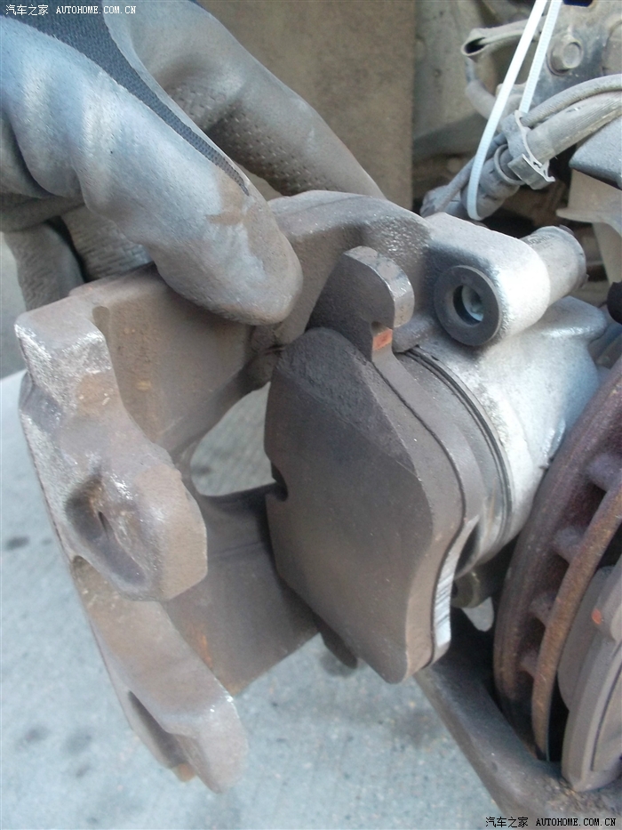 图六:拆下卡钳(外侧刹车片已经卸除,大拇指处为内侧刹车片)