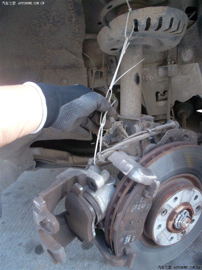图七:别忘了把拆下的卡钳用尼龙扎带固定住,免得意外掉落导致扯断线路或损坏零部件等