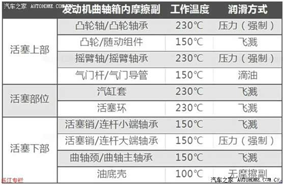 由于曲轴箱内需要润滑的各个部位的工况不同,所以就要求机油在不同工况中都能表现出适当的粘度和润滑性能。下图为一般发动机暖机状态曲轴箱内各摩擦副的工况。