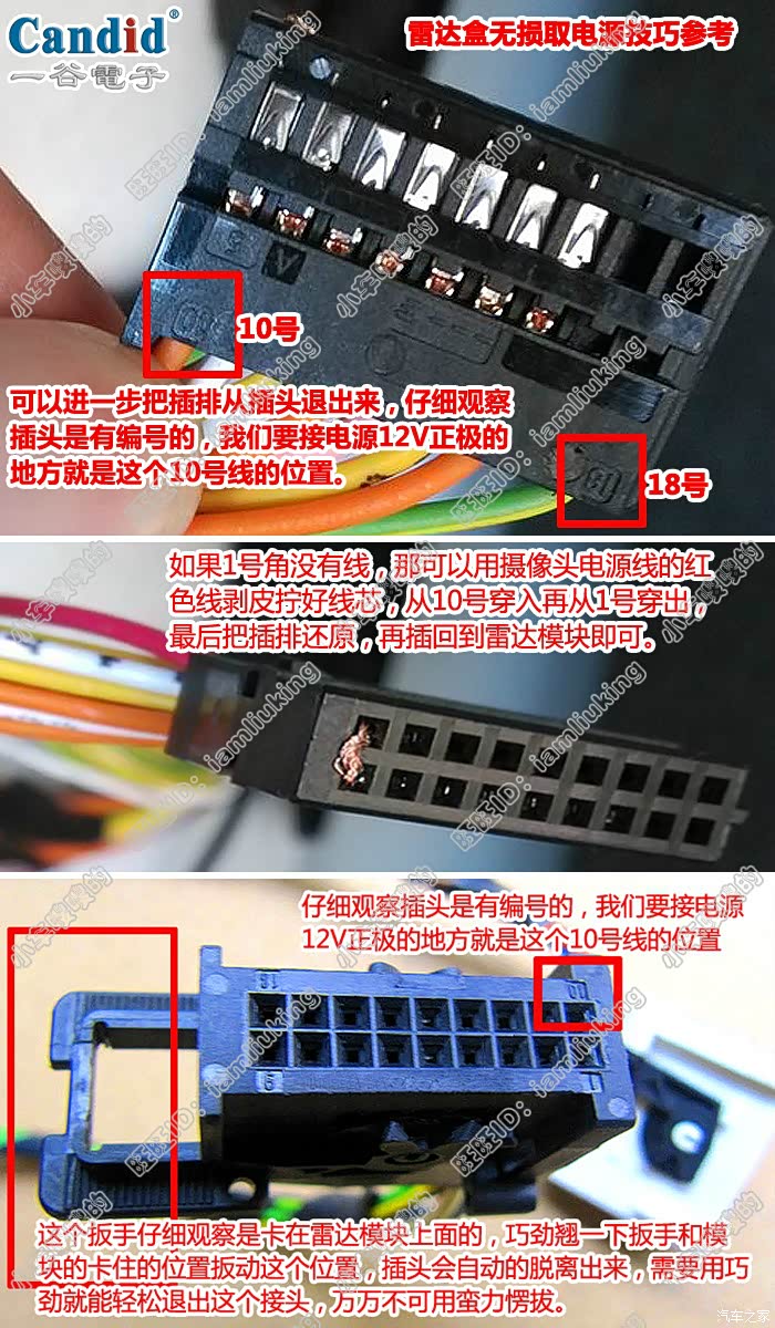 摄像头的话,如果自己动手能力强的话,你就按如下图片顺序安装吧!不会的话,就出去叫别人安装大概100-200元。如果买的不是原装的摄像头的话,就要参考下面图的安装方法了,下面的都是教程来的,还是上面的那个图也是,这个你们就看图安装了,摄像头取点就是用雷达的10号线取电,别去后照明灯取电了。