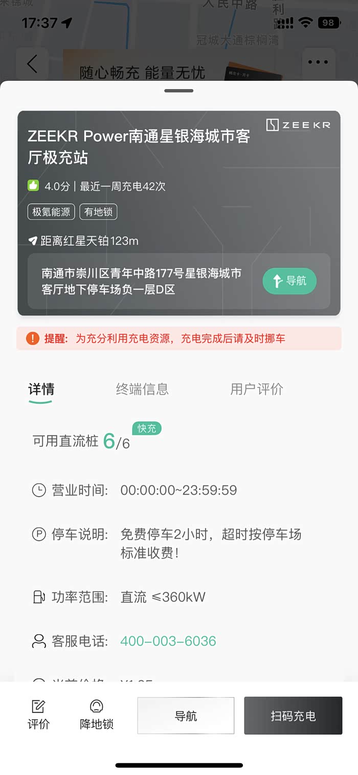4月份订车的时候当时本地还没有一个官方充电桩,随着等车时间的推移,本地的充电桩陆续多了起来。当9月初提车的时候没想到已经有4个官方充电桩。下面简单的分享一下使用官方充电桩的感受,首先在极氪APP上找到充电地图,筛选出自营充电桩,找了一个距离公司最近的充电桩。在一个新开商场的地下停车场,停车还免费于是直接导航开了过去,由于之前来过这个商场停车场里面还算是比较熟悉,下到负一层后很快就找到了官方极充站,环境很亮真的很有感觉。由于是新开的充电桩而且本地极氪车主也不算很多,所以充电位置都是空的,我随便挑了一个车位停好,拔下充电枪极氪的快充盖板居然会自动打开,还是很高级的,相对于其他的快充站,自营的充电线真的要轻了很多,这点好评。插上后用手机APP扫码启动 可以设置插入即冲 也可以设置积分抵扣,这点确实很人性化。每个月签到的或者发一些帖子给的积分用来充电也是极好的。设置好以后扫码启动,大概等到20-30秒左右充电正式开始 可以看到车机上已经显示快充中了,由于只有我一台车在充电,充电的功率还是很强的 不愧是极充站。车机上也显示预计充电剩余时间,这段时间可以选择在车上开启小憩模式休息也可以去商场里面逛逛,由于正好肚子饿了我选择了后者。进去商场点了汉堡王回车里的时候又带了一杯饮料,大概用了30分钟左右,这时候看手机APP上已经充到了80%了。80%以后充电速度会开始变慢,因为需要更好的保护电池寿命。坐到车上休息了大概15分钟已经充到了95%,由于极氪夏天的保护机制充到95%以后会自动结束充电,所以这次就只充到了95%。从25%充到95%用时49分钟充了62度电,个人觉得还是非常满意的,而且价格也没有比其他第三方的充电站贵上很多环境也更好,总体还是非常满意的。希望后续能建设更多的充电站。