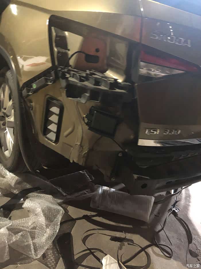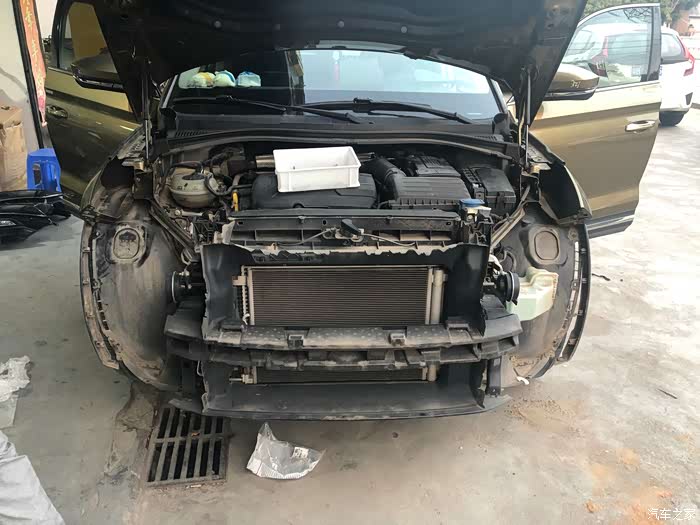 前杠拆下来,去装前雷达去了,留个前防撞梁看看。发动机上的白筐里是卸下来的螺钉,一个都不要丢掉,也不要出现装完了多了几颗螺丝的,一钉一铆都是有数的。